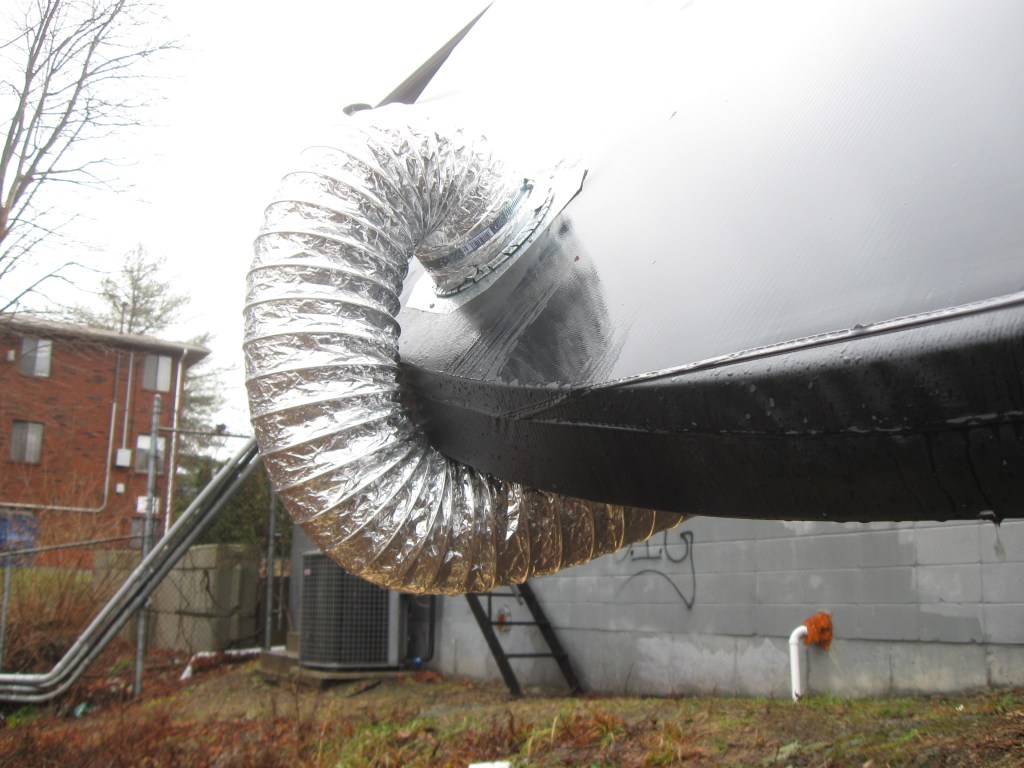 While this idea was simple in theory, it proved devilishly tricky in practice. It’s surprisingly difficult to get enough heat into that space to melt any snow on the cover. You’d think even room temperature air (about 70 degrees) would be more than sufficient but it’s not even close; you lose a lot of heat in the ductwork even though it’s only 25ft or so, and 6 inches in diameter, and well-insulated. It took getting temps up to around 120 degrees and airflow up above 1000 CFM to overcome outdoor temps frigid enough to allow snow/ice to build up in the first place.