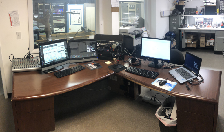 A panoramic image of the Backup Studio. Back in the old WRCP days (pre 1998) this was an actual studio, hence the dual-paned/angled windows. WBUR converted it into an office/workship when they bought it and turned it into WRNI in 1998.