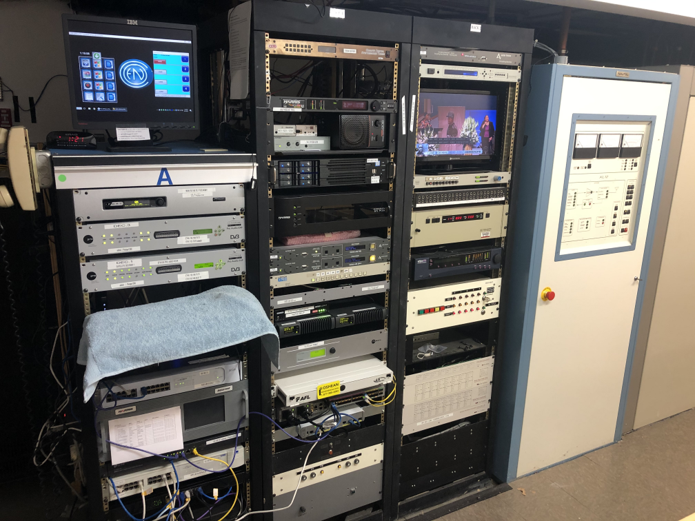 Visible through the windows of the studio itself, here’s the utility racks. This is the transmitter site for WPVD 1290AM; the backup Nautel AM transmitter is the blue/tan box on the right. Some ancillary gear is on the right-hand rack for the transmitters as well. The rack on the right has the two IDC SFX4104 satellite decoders from PRSS; they connect to a 12ft diameter satellite dish out back. That’s how TPR gets its NPR & BBC, et al programming normally. The backup studio is just taking advantage of the fact that the gear is already physically here.