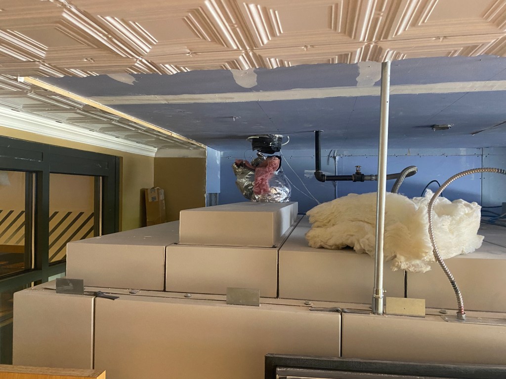 While up there, I took the opportunity to install a pain of 8in 500CFM duct fans into the intake/outflow (baffled) air vents in the ceiling of the booth. There were insulated ducts connected directly to these vents while at the United, but there’s no means of doing that here. We’re already finding it’s not really enough; the existing HVAC doesn’t put enough chilled air over the booth for the vent fans to suck in and circulate inside the booth, so it gets toasty in the booth; fans can only cool down to about +10F degrees above ambient. So if it’s 70F in the room around the booth? It’s 80F inside the booth. Yuck. We have a plan to extend a floor vent up to there to help with that.